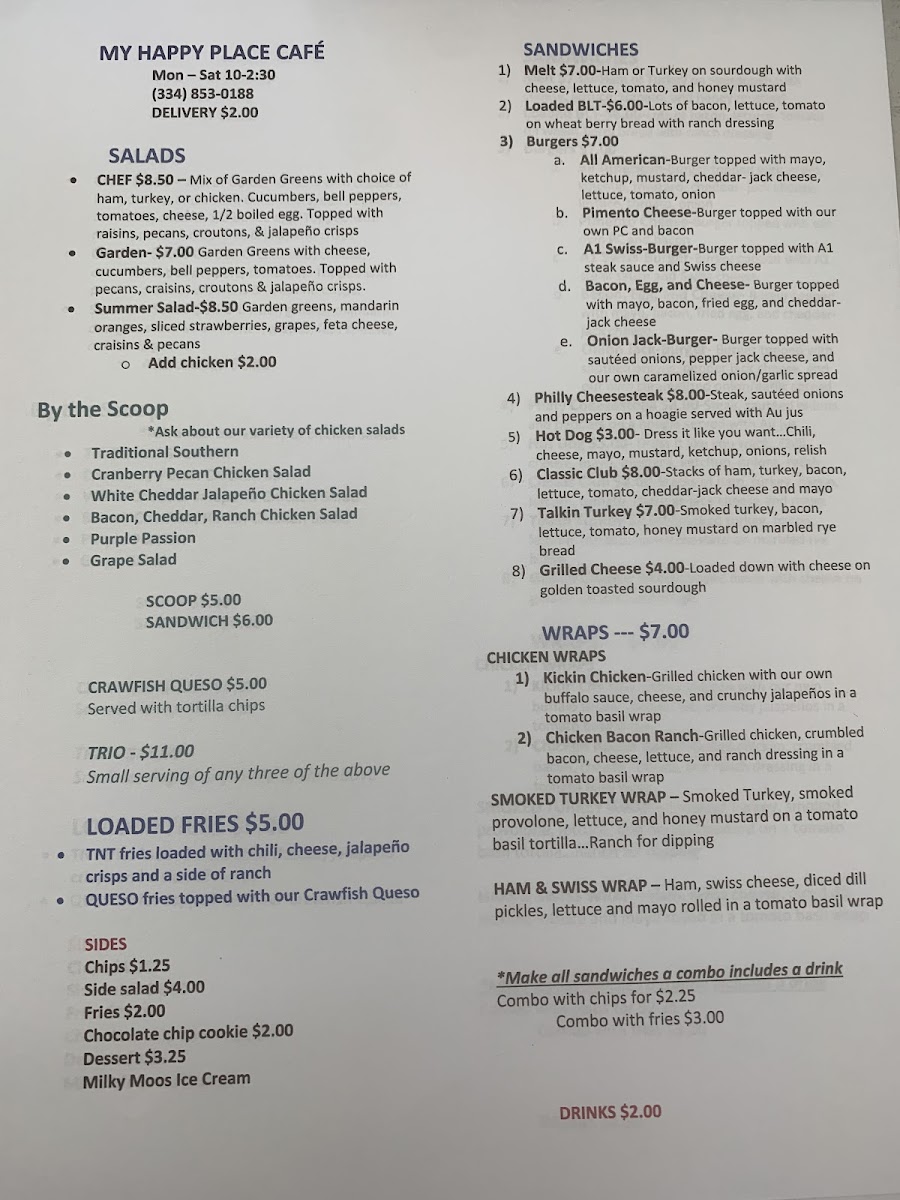 Welcome to My Happy Place Cafe, your go-to spot for delicious eats in Elba, AL. Located at 979 AL-203, this charming cafe has quickly become a beloved local gem, recognized for its warm atmosphere and attentive staff.